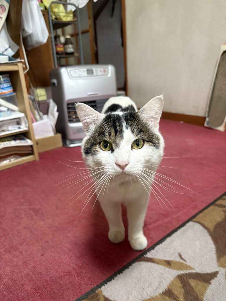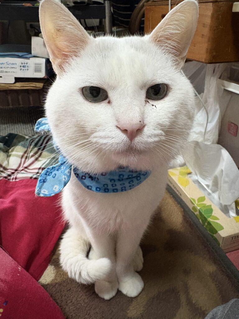 こちらは、白いのですがくろです。うちの父親がなくなった年に現れました。もう7年くらいになりました。大人しいあまり泣かないねこです。外へ出しても30分くらいで帰って来ます。